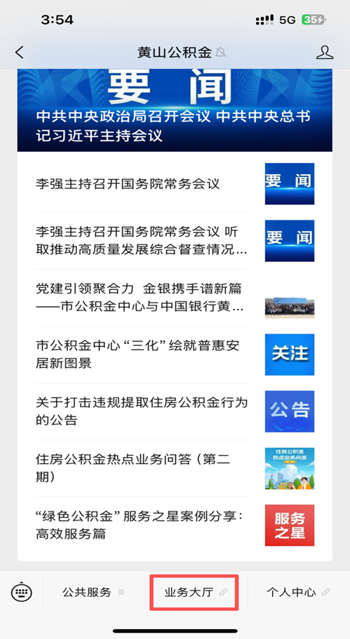 第一步:登录“黄山公积金”微信服务号,点击“业务大厅”。