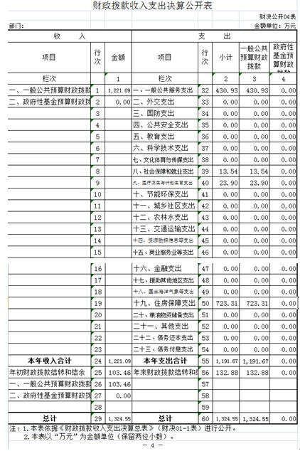 2017年度收入总计1221.09万元、支出总计1191.67万元。与2016年相比,收、支总计各增加122.13、144.54万元,增长11.11%、13.80%,主要原因:一是一般公共服务支出增加;二是住房保障支出增加。