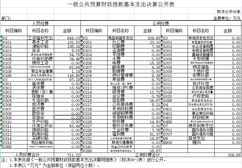 2017年度财政拨款基本支出920.88万元,其中人员经费711.22万元,主要包括:基本工资、津贴补贴、奖金、其他社会保障缴费、伙食补助费、机关事业单位基本养老保险缴费、职业年金缴费、其他工资福利支出、退休费、奖励金、住房公积金;公用经费209.65万元,主要包括:办公费、印刷费、水费、电费、邮电费、物业管理费、差旅费、租赁费、会议费、培训费、公务接待费、劳务费、工会经费、福利费、公务用车运行维护费、其他商品服务支出。